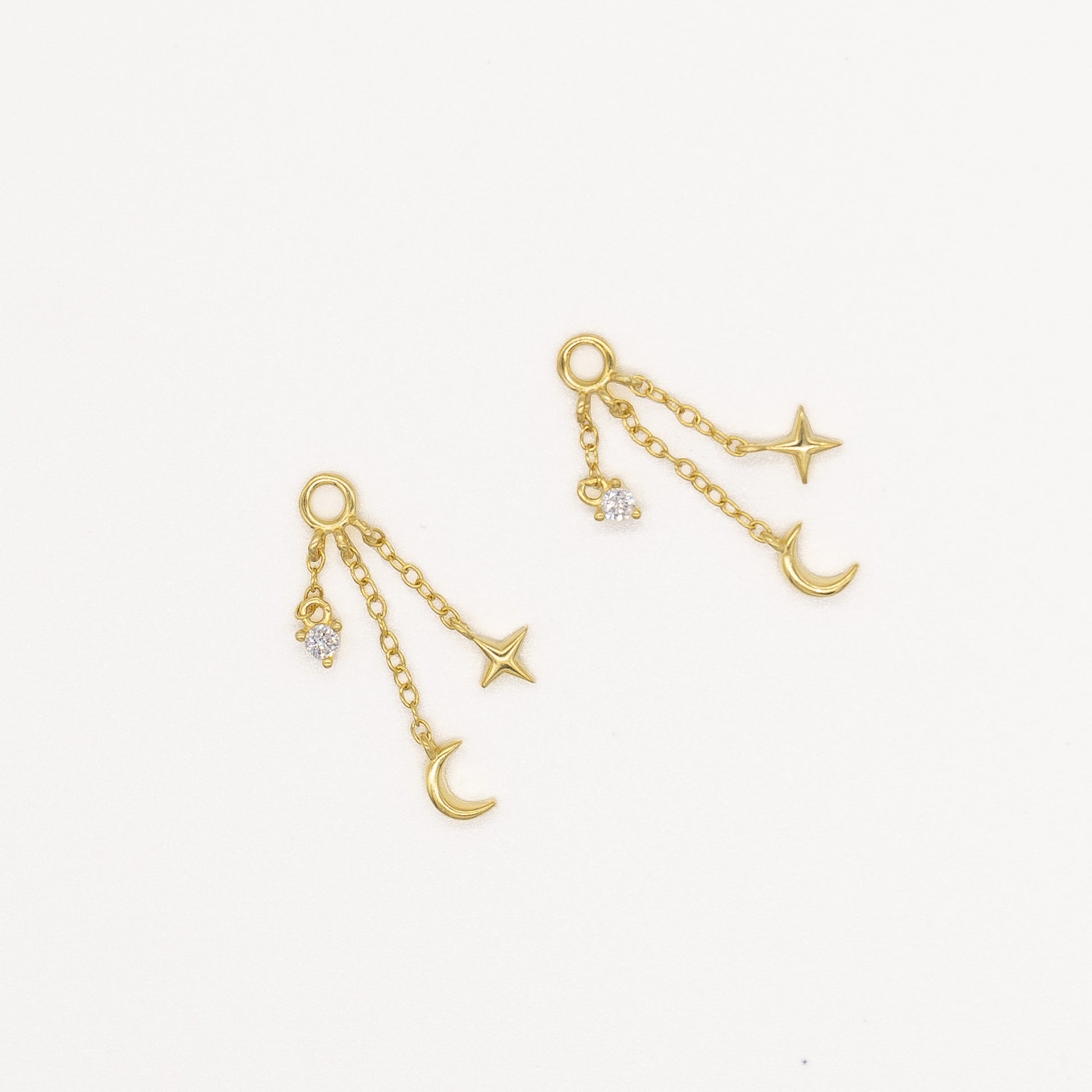 Cosmic Trio Charm, en trippelt-anheng i 925 sterlingsølv, tilgjengelig i sølv eller gullbelagt. Har tre delikate kjeder med en halvmåne, en stjerne og en liten glitrende zirkonia detalj. Laget for ringer/huggies; glir lett på. Selges enkeltvis eller som et par.