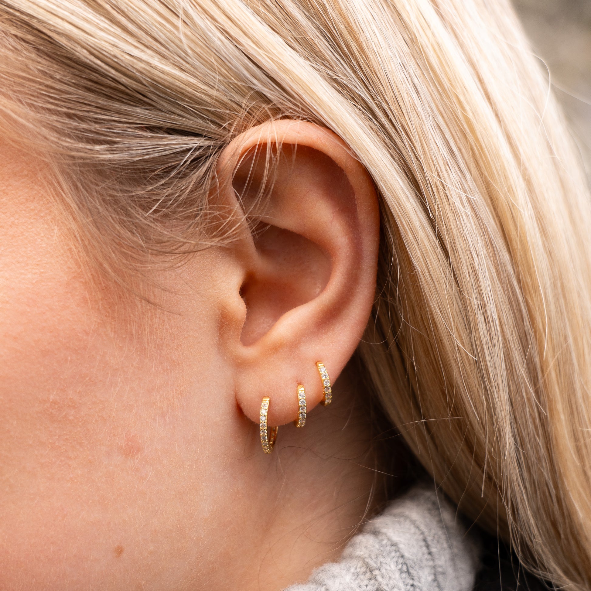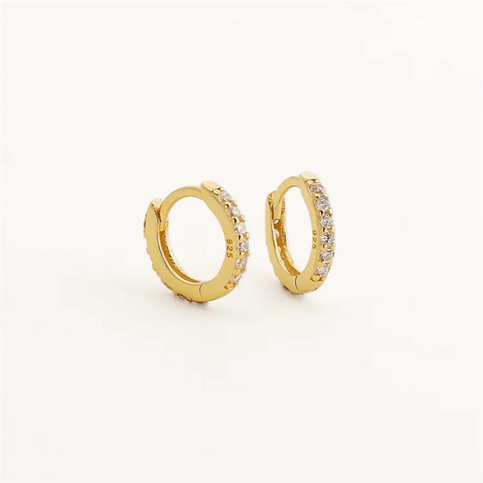 Aster Huggies Mini 7 mm – petite zirconia-set hoops. Crafted in 925 sterling silver; available in silver or gold-plated silver. Click-hinge closure, lightweight for everyday wear and stacking. Pairs perfectly with our Aster Huggies in 10 mm.
