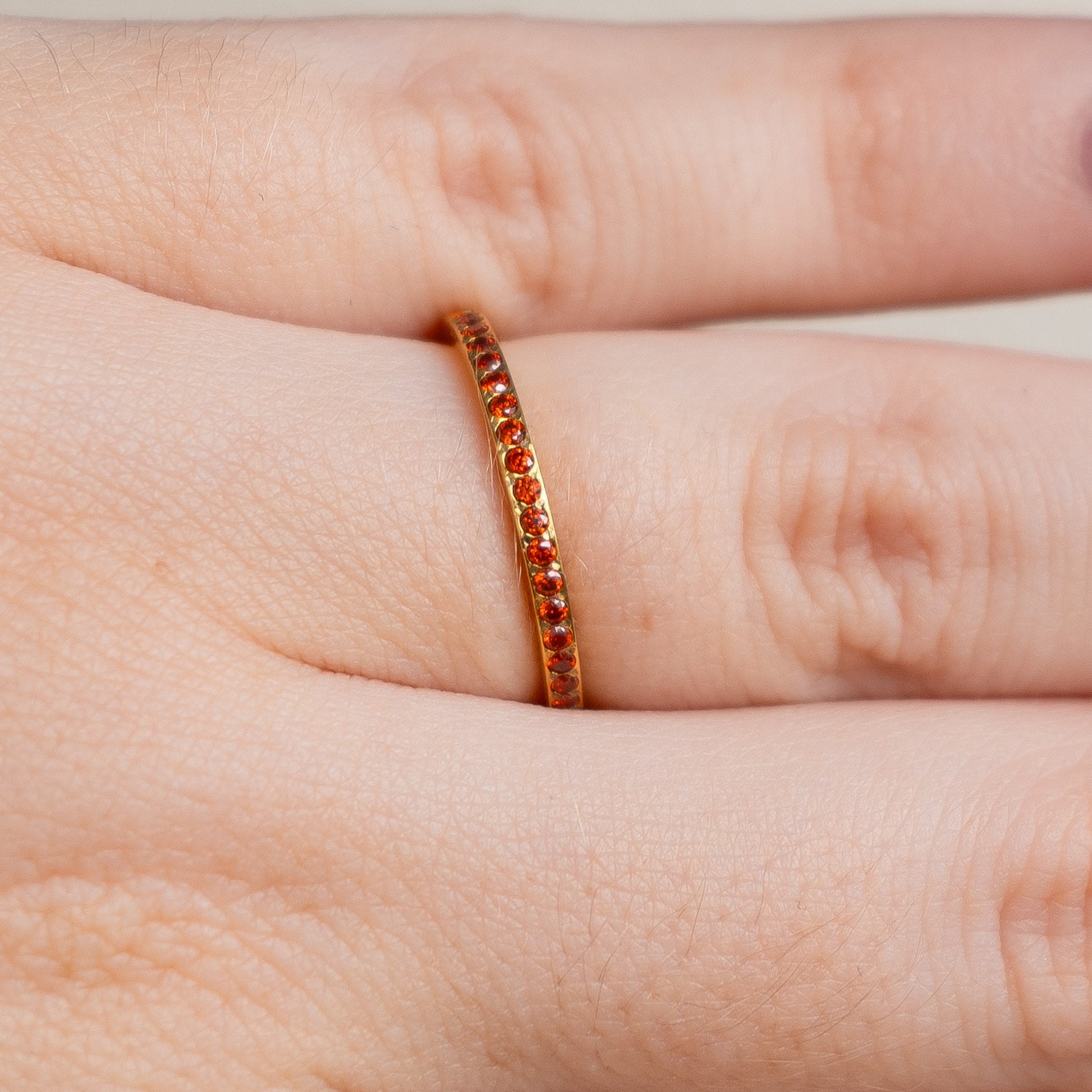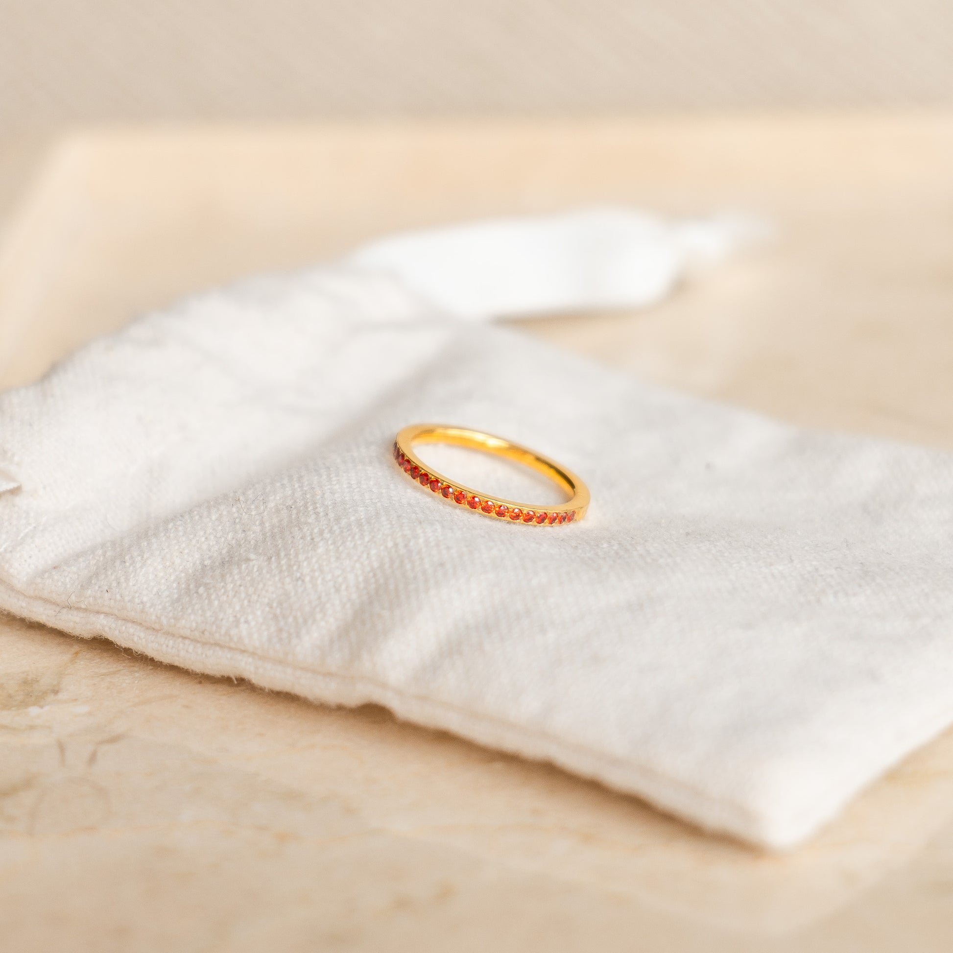 A subtle spark with a golden glow. The Clara Ring is crafted from gold-plated stainless steel and set with red-orange zirconia stones that shimmer with warmth and depth. Designed to catch the light beautifully, it adds a refined touch to any stack or stands elegantly on its own.